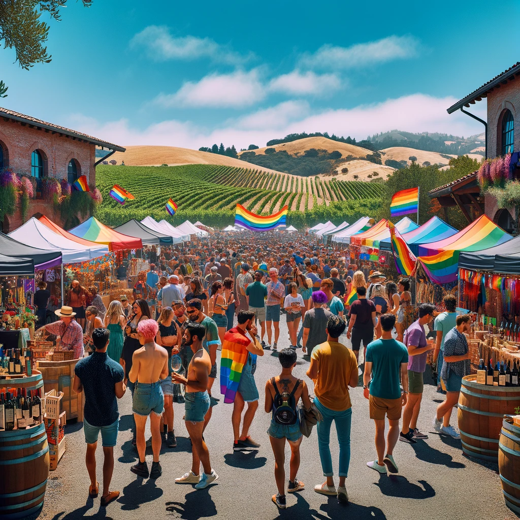Pride street fair set in picturesque wine country. The scene captures a festive atmosphere with people enjoying the event among vineyards. Take a look!